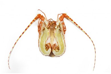 Disposez la langouste, coupée en deux dans le sens de la longueur, côté carapace, sur une plaque recouverte de papier sulfurisé.